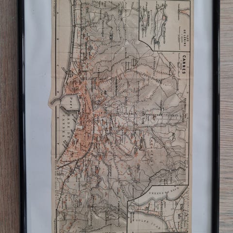 Vintage vægdekoration med et kort over Avignon, indrammet i en træramme. Kortet viser detaljerede gader og områder i byen Avignon. Rammen er lavet af træ og har en støtte på bagsiden til bordplacering. Velegnet til indretning eller som samlerobjekt. Fra 1910. Måler 18 x 22 cm