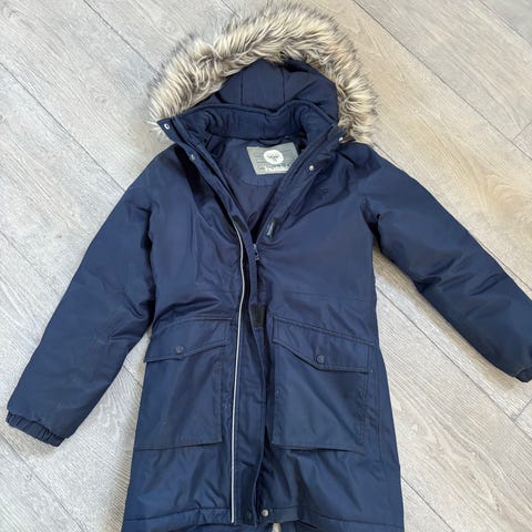Helt nye waterproof Hummel børne vinter jakke i størrelse 92, marineblå farve med mønster og pelskant på hætten. Jakken er designet til børn og har refleksdetaljer for øget synlighed. Materialet er velegnet til udendørs brug i koldere vejrforhold.