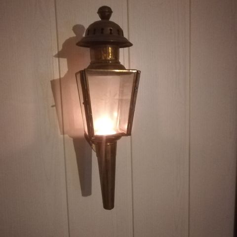 Messing lampe med glaskuppel til fyrfadslys. Hænges op på væggen. Flot stand.