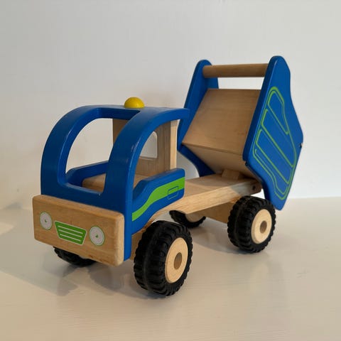 Fin blå trælastbil af mærket Kids Wood med gummihjul, kører helt som den skal. Vippelad. Små brugsspor, se annoncens fotos. Røg- og dyrefrit hjem. Sendes gerne. Spørg, hvis du vil vide noget om bilen.