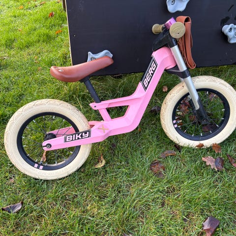 BERG Biky Retro løbecykel i lyserød farve med brun sadel og håndtag. Uden taske