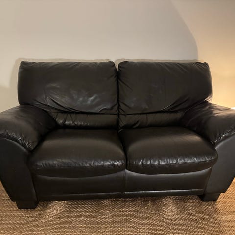 Black two-seated couch in leather (1.6m x 0.9m).