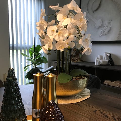 Kunstig orkide i str. XL i champagnebowle/køler i sølv (rustfri), håndlavet dekoration i størrelse ca. 70 cm. Høj og bowle Ø36. Smuk til hjemmet, kontoret, forretningen, caféen, salonen eller en god gave ide. Prisen er fast pga. materialerne. Kan ikke sendes pga. størrelsen og vægten. Men kan hentes enten i Ballerup eller Ølstykke.