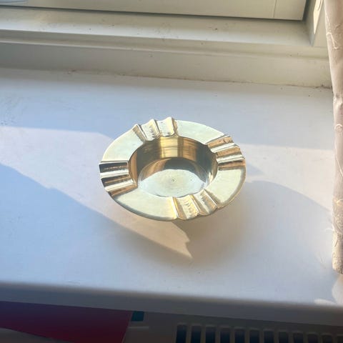 Unikt vintage askebæger eller dekorativt fad med klassisk cigarbands-design i røde og gyldne nuancer.