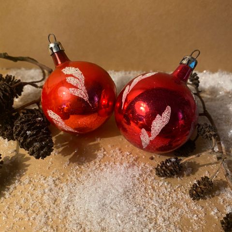 3 æsker ældre glasjulekugler sælges samlet for 115kr. På to af de store kugler, er der mælkehvidt skær, og den mindre blå kugle har mistet lidt farve - ellers er alle okay.