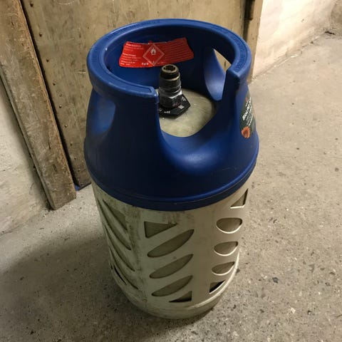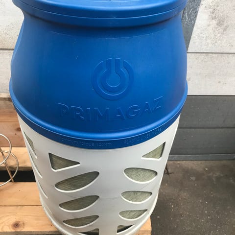 Primagaz gasflaske med en kapacitet på 10 kg. Fremstillet i gulmalet stål og udstyret med ventil.