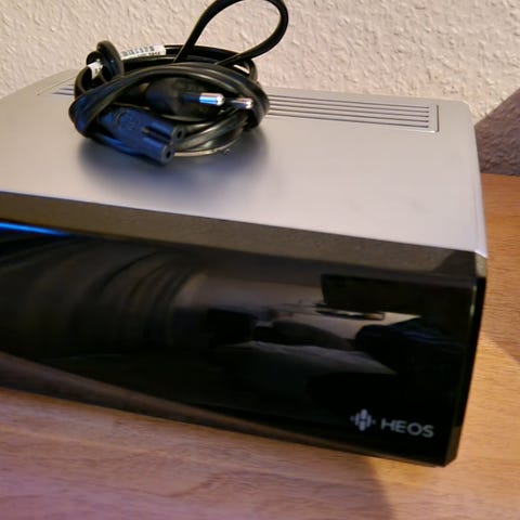 Denon HEOS Link HS2 Musikstreamer med sort finish. Enheden har flere tilslutningsmuligheder, herunder analoge og digitale lydudgange, Ethernet-port, USB-port og netledning. Designet til at integrere med HEOS multiroom lydsystemer, kompatibel med forskellige lydformater og streamingtjenester.