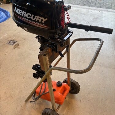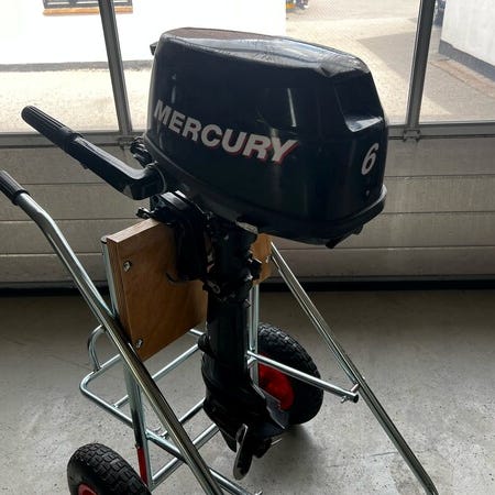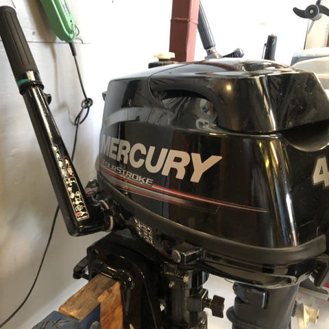 Brugt 4-takts påhængsmotor med langt 20" motorben årgang 2020 Mercury F4MHL 4hk Manuel start og håndstyring. Indbygget tank ca. 1,5lt
