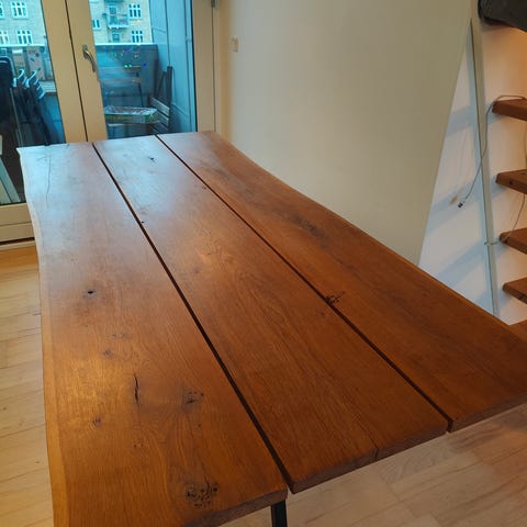 Smukt snedker lavet spisebord i fyrretræ. Med bordbukke fra Hay.