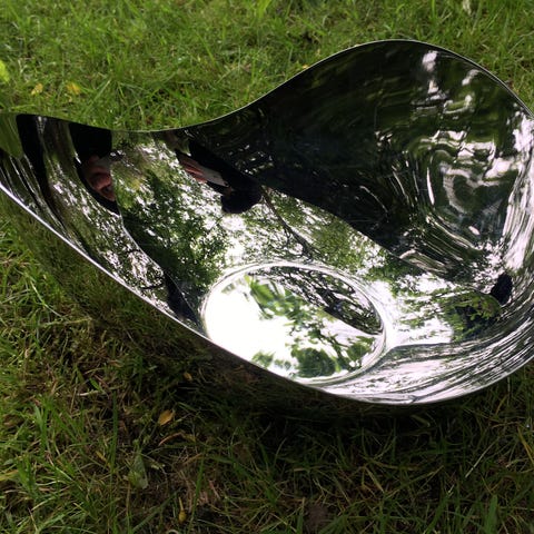 Georg Jensen Bloom Collection skål med tilhørende ske, designet til brug ved forskellige højtider. Fremstillet i metal med en blank finish, egnet til dekoration eller servering.