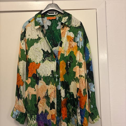 Meget smuk og unik Stine Goya skjorte i størrelse L. Skjorten er beige og har knapper foran. Den er dekoreret med grafiske motiver i forskellige farver på både for- og bagside. Desuden syet med farvede stikninger.