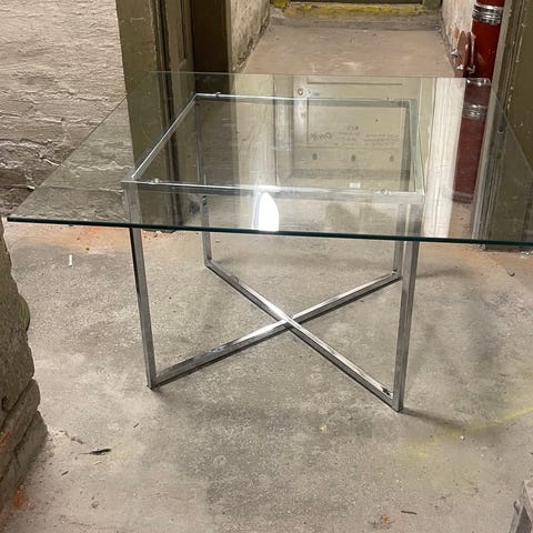 1 sæt glas sofaborde fra Chic Antique lille bord 65 cm i diameter og 38 cm høj ….stort bord 75 i diameter og 45 cm høj brugt fejler intet industrielt look nypris 3800kr Hentes i 8620 Kjellerup