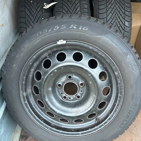 Sæt bestående af fire vinterdæk med stålfælge. Dækstørrelse 205/55 R16, mønsterdybde målt til ca. 5 mm. Dækkene er beregnet til brug på personbiler og er velegnede til vinterkørsel. Fælgene er i stål med flere ventilationshuller.