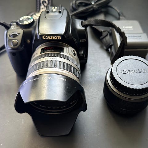 Canon EOS 750D Digitalkamera med APS-C sensor, sort farve. Kameraet er designet til fotografering og videoptagelse med mulighed for udskiftning af objektiv. Den har indbygget Wi-Fi og en 24,2 megapixel opløsning.