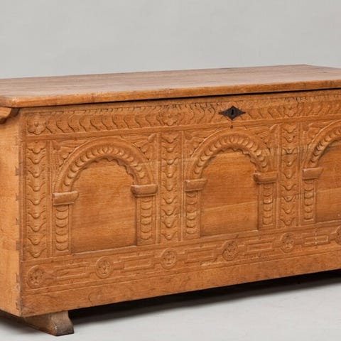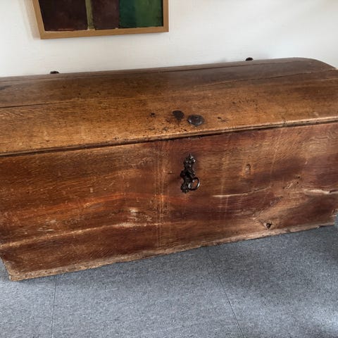 Meget gammel massiv egetræ’s kiste med udskæringer på fronten. Håndsmedede håndtag og beslag. Brede 85 cm. Dybde 40 cm. Højde 50 cm