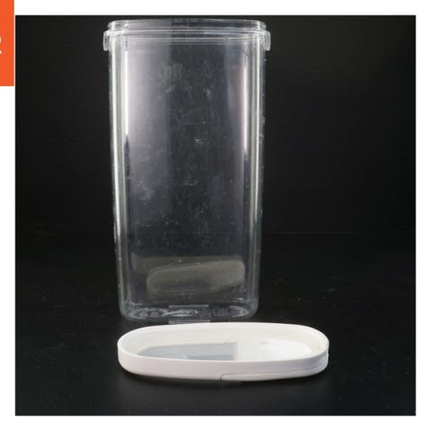 Plastik madkasse med firkantet form og grøn låg. Egnet til opbevaring af madvarer. Materialet er plastik, og størrelsen passer til mindre portioner eller snacks.