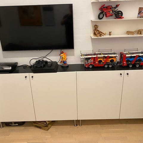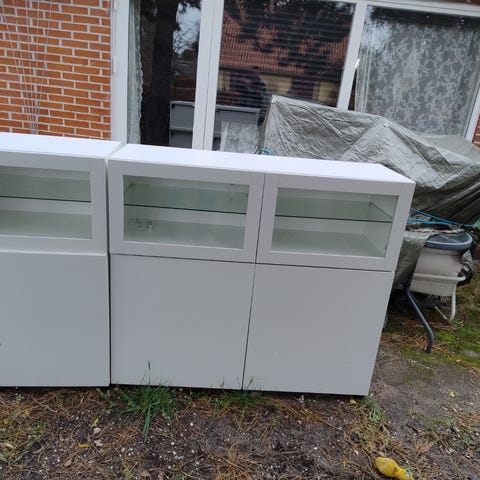 Skænk/ skabe sælges med en lang glas plade på toppen. Den består af to skabe plus 1 skab som er sat sammen. Der er boret hul i bagepladen så den hænger på væg men der medfølger også 4 ben så den kan stå på gulvet.