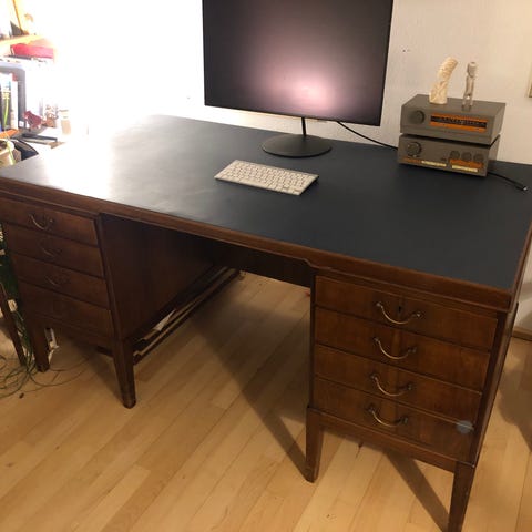 Super flot skrivebord i egetræ med grøn linoleum på bordpladen.