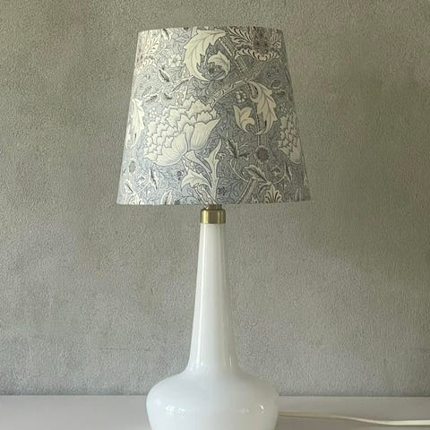 Bordlampe i hvid glas og messing med plisseret lampeskærm