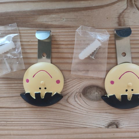 6 stk. morfo børneknager i lakeret metal. Ca. 10 cm høje.