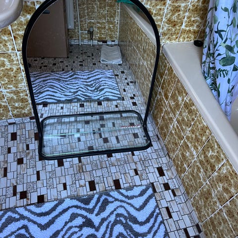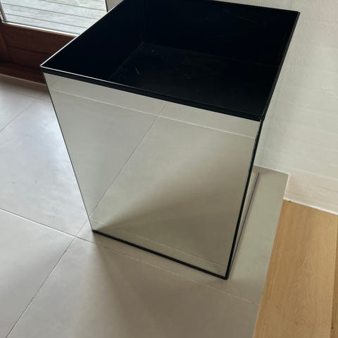 Der er spejle på alle fire sider og i toppen en sort blomsterkumme / rummelig opbevaringsplads / opbevaringskasse til bøger / strikketøj / nips. Selve opbevaringsdelen er 15 cm dyb.