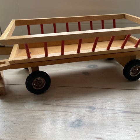 Træ model vogn i miniature størrelse med detaljeret udskæring. Vognen har en rød polstret sæde og et åbent lastrum bagpå. Materialet er ubehandlet træ, og vognen måler cirka 30 cm i længden. Velegnet til dekorative formål eller som samlerobjekt.