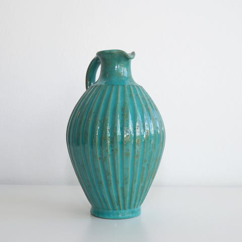 Med bløde vandrette riller og små hanke. Mat rødlig/lys-spættet glasur.