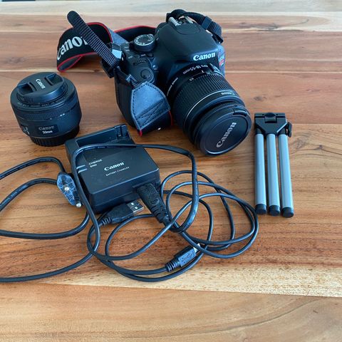 Canon EOS M3 spejlreflekskamera med udskifteligt objektiv, kamerarem, batteri, speedlite 90 ex blitz og USB-kabel. Kameraet har en drejelig skærm, hvilket gør det velegnet til forskellige fotograferingsvinkler og selvportrætter. Objektivet er kompatibelt med Canon-systemet og er velegnet til både foto og videooptagelser.