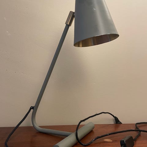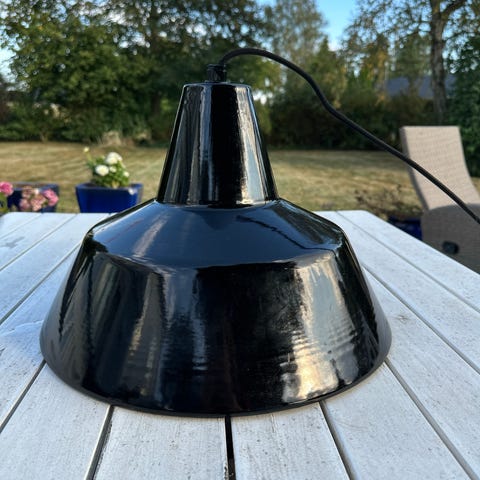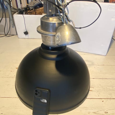 Rustik metal lampe I gammel 20 liter diesel dunk. Farven er grøn med synlige rustpletter, hvilket giver den et vintage udseende. Lampen har et håndtag på toppen, sort pære og sort ledning