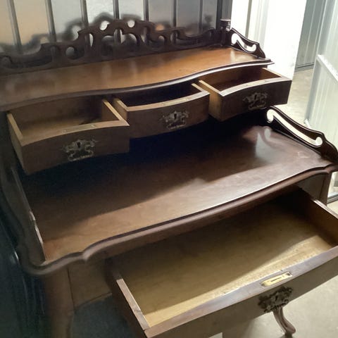 Pænt Chatol og bord. Chatol er med udtrægsplade, når man åbner det, + med 3 små skuffer. Der er en lille skade, som er mindre end en lillefinger negl. Afhentes på en gård, i Haslev ved Næstved