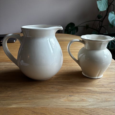 Smukt sæt i stilrent design, passer til både kaffe og te krus, i glaseret keramik. Kanden er ca.11 cm høj.