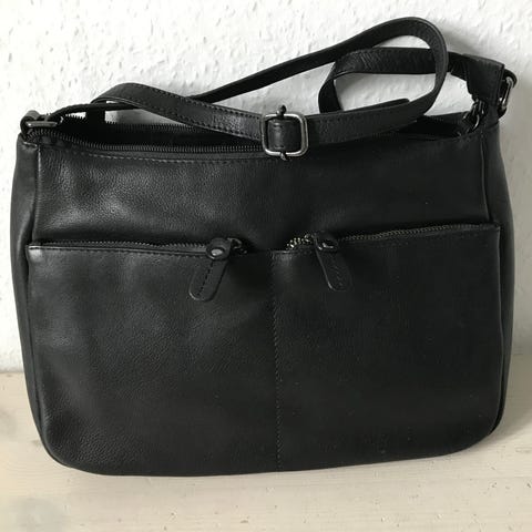 Tasken har 1 stort rum med 1 mindre lynlås rum og uden på har den 2 større rum bag på og foran