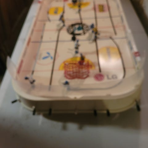 Ishockey spil til at stille på bord eller gulv. Sugekopper under så det står fast. Den ene målmand glider ikke lige så let, derfor den lave pris