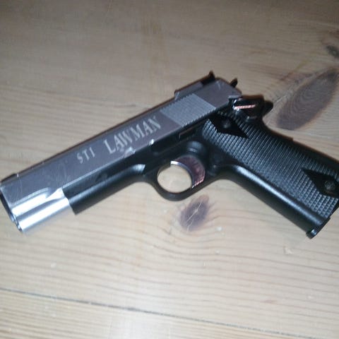Den er lidt slidt den er knækket ved skyde hullet men skyder helt fint (og rigtig hårdt) helt fin stand