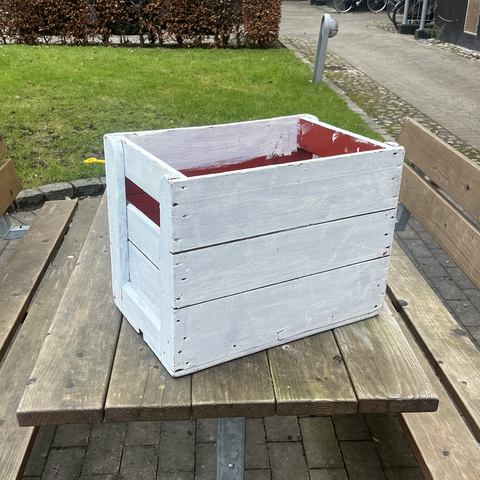 Ølkasse med Ceres skrift. Er sandsynligvis malet en gang med noget rød maling.