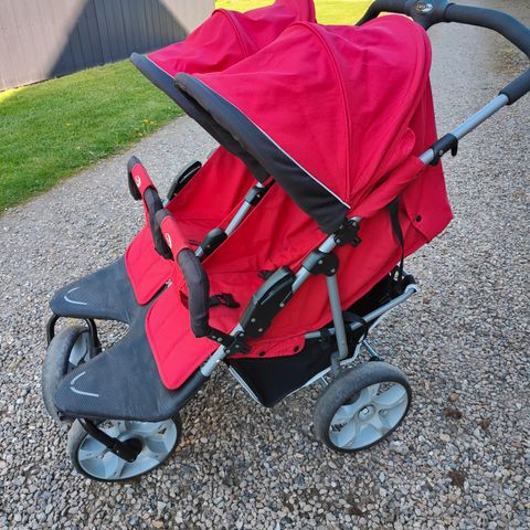 Carena dobbelt barnevogn i sort farve med to sæder. Barnevognen har store hjul og en robust stelkonstruktion. Egnet til transport af to børn samtidigt. Materiale og størrelse er velegnet til udendørs brug.