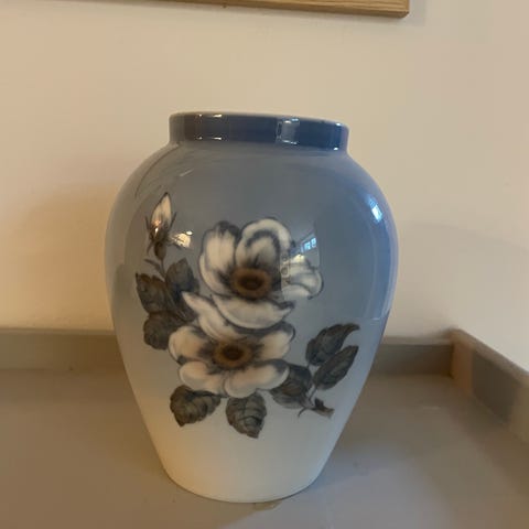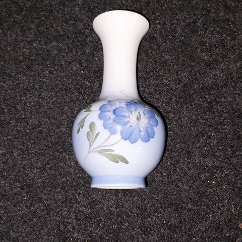 Royal Copenhagen Blomstervase i porcelæn med hvid og blå farve. Vasen har en blomstermotiv dekoration og er egnet til dekorative formål i hjemmet. Materialet er porcelæn, og vasen har en klassisk form med en smal hals.