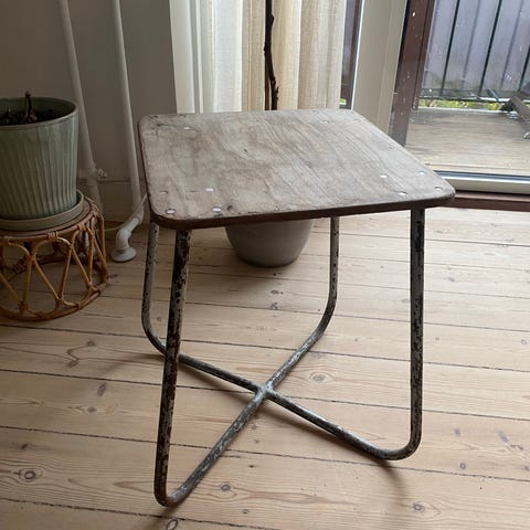 Lille firkantet træskammel med rødt stel og blåt sæde. Skamlen har et slidt og brugt udseende med synlige brugsspor. Vær opmærksom på, at sæddet skråner