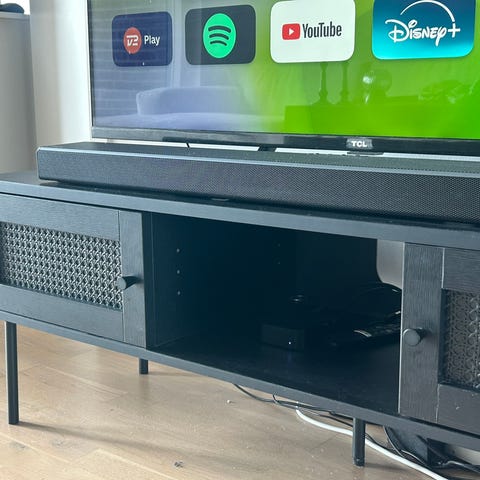 TV bord i mørk træ med hvide låger i siderne og hylde i midten
