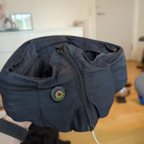 Hövding Airbag Gen 1 designet til urban cyklister, størrelse S. Produktet fungerer som et alternativ til traditionel cykelhjelm ved at udløse en airbag ved sammenstød. To syninger er gået op foran, som helst skal repareres, derfor den lave pris. Elektronikken er testet og fungerer perfekt. Et mikro-USB opladerkabel følger med, hvis du har brug for det