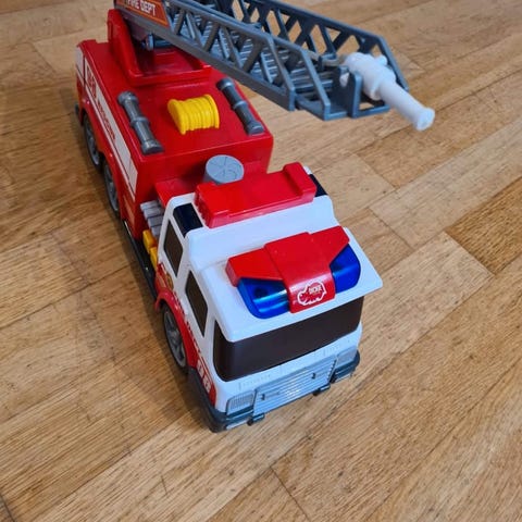Solid brandbil med lys og lyd. Den kan sprøjte vand med slangen. I god stand. Skal have nyt batteri.