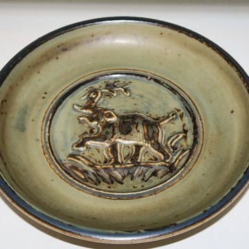 Royal Copenhagen 212/3 keramik tallerken med et relieff af et elefant i midten. Tallerkenen har en brun og beige glasur med en rund form og let opadgående kanter. Bunden er mærket med Royal Copenhagen logo, serienummer 212/3 og et håndlavet initial. Tallerkenen er velegnet til dekoration eller samling.