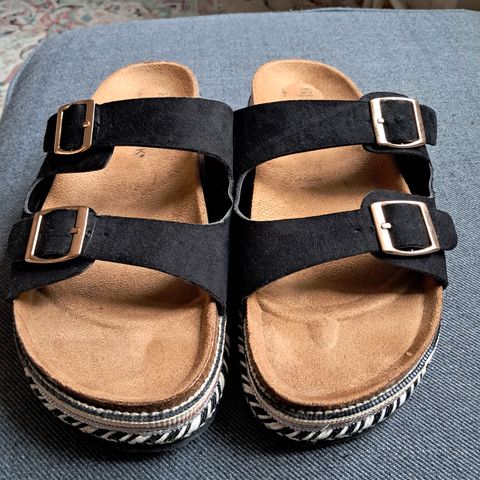 Primark sandaler i pink farve, størrelse 40. Sandalerne har en blokhæl og en bred rem over foden. Materialet er plastisk med en glansfuld finish.