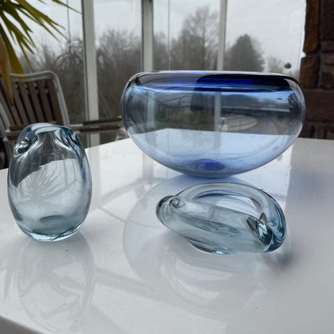 3 fine glasting, formentlig fra Holmegaard. Kande og den største skål er 6 cm høj og den lille med hank er 4,5 cm høj.