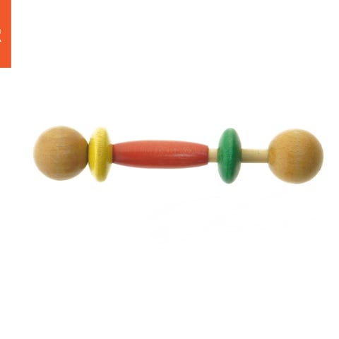 Babyrangle i træ med masser af farver. Sorte elastiksnore.