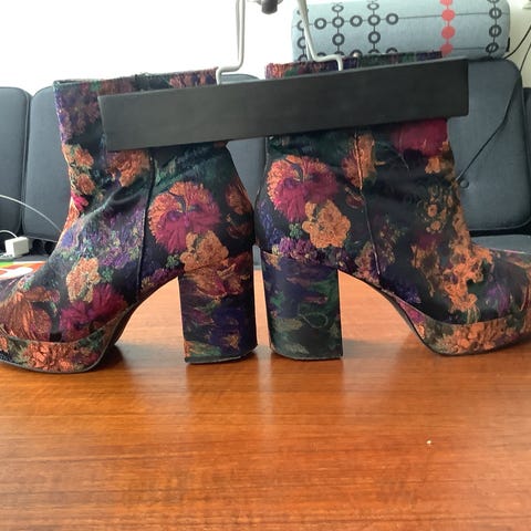 Primark højhælet sko i sølvfarve, størrelse 40. Skoene har en blokhæl og flere remme over forfoden samt en ankelrem. Materialet har en blank, metallisk finish.