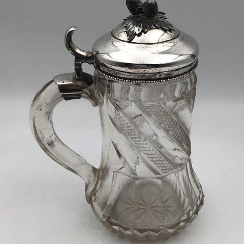 Ølkrus i keramik med sølvlåg og 3 tårnet stempel og årstal 1721 den er 21 cm høj den er i brugt stand.