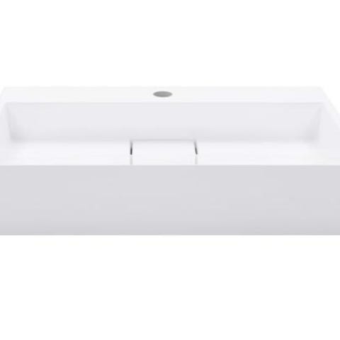 Håndvask med marmor plade på en hvid rummelig hvid skab.