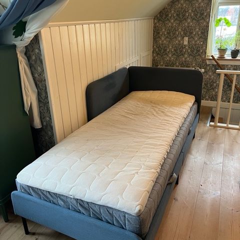 Blåkullen sengestel inkl. lamelbund. Siderne kan vendes så den kan være højre eller venstrevendt. Ingen pletter eller huller. Fin madras kan medfølge.