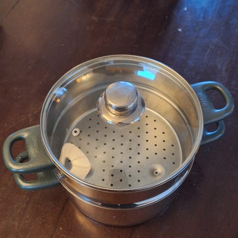Gryden til at dampe fisk el. grøntsager til perfektion. Ikke til induktion. Brugt en gang.